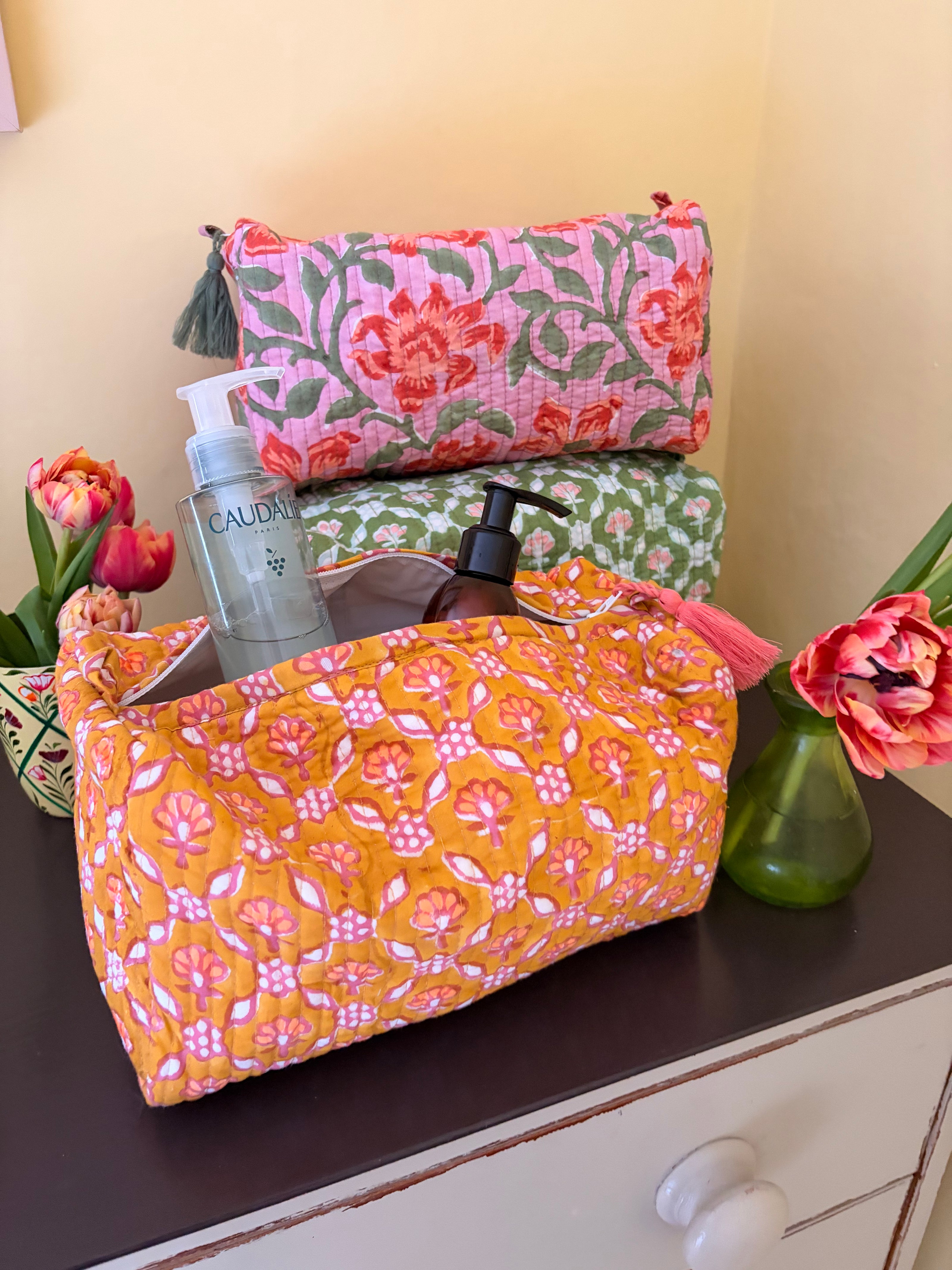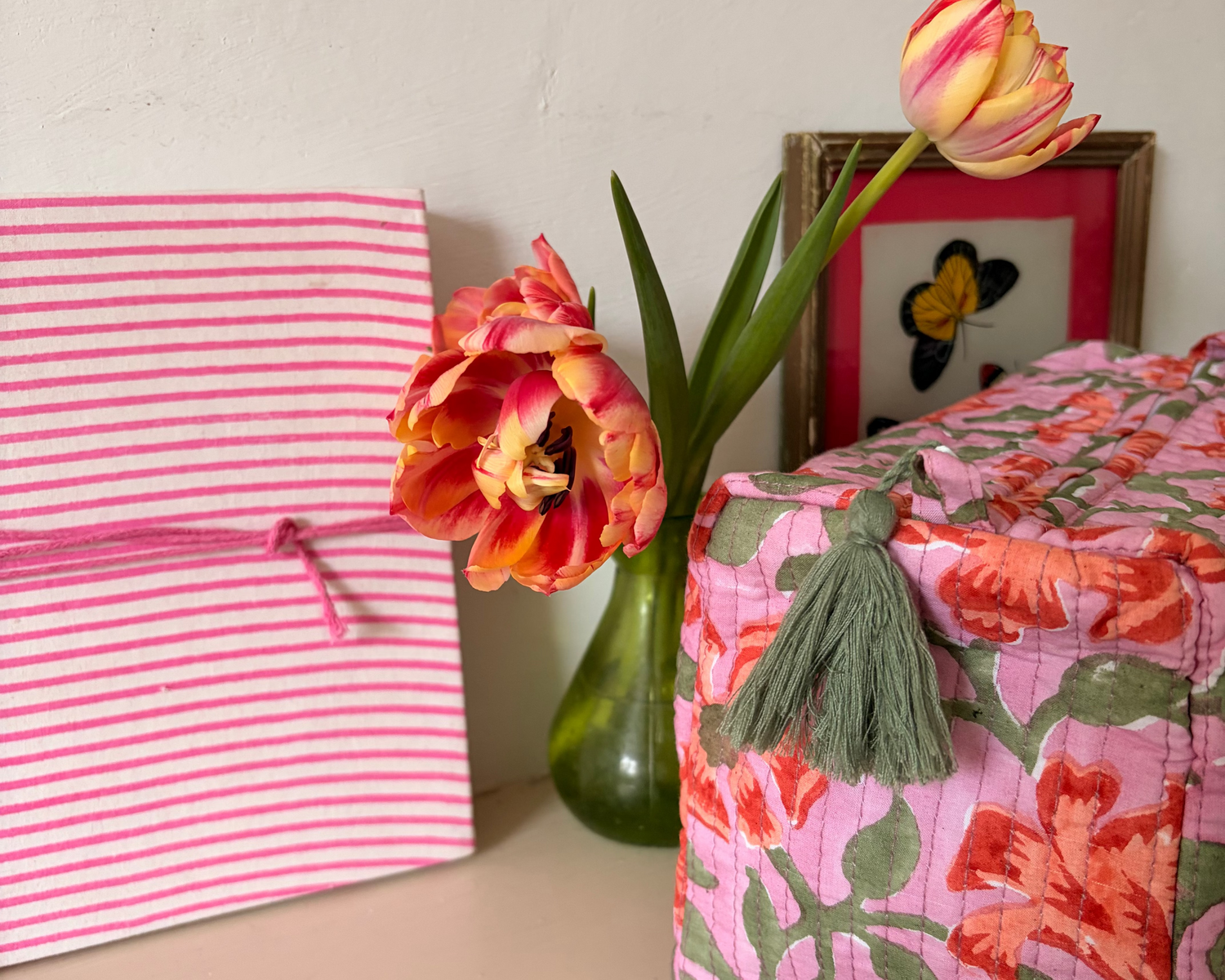 Buy a Large Cosmetic Bag or Medium Indian Glass Painting, and receive a FREE block printed notebook.